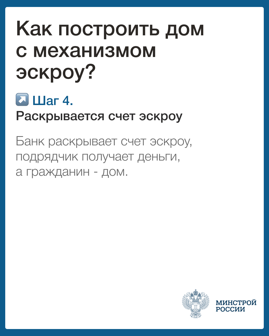 Минстрой России подготовил информационные карточки на тему: Что такое эскроу счёт и почему это гарант безопасности денежных средств для тех, кто взялся за строительство своего дома.